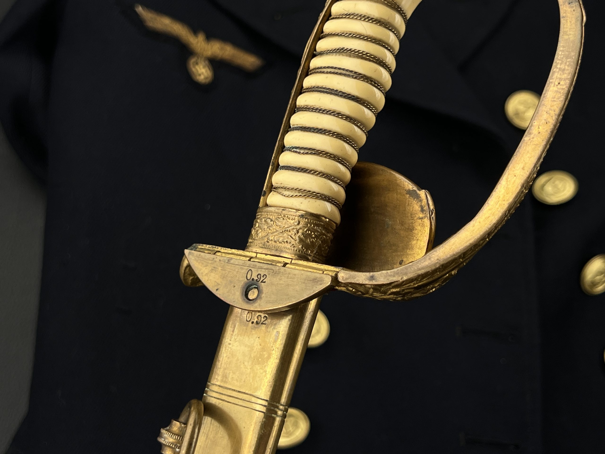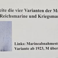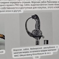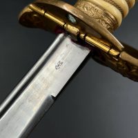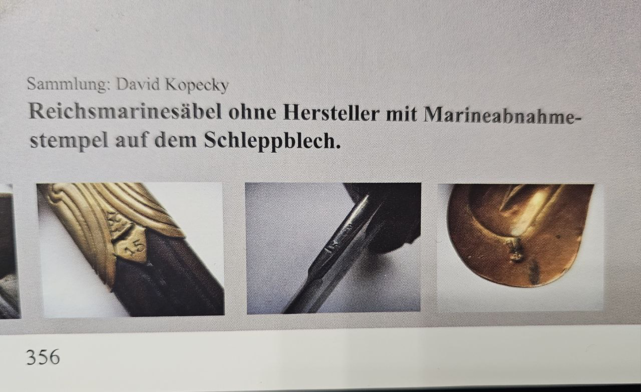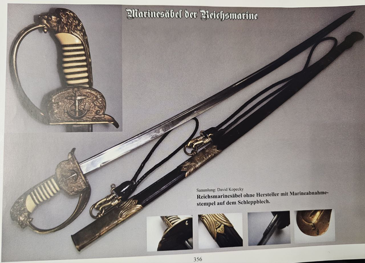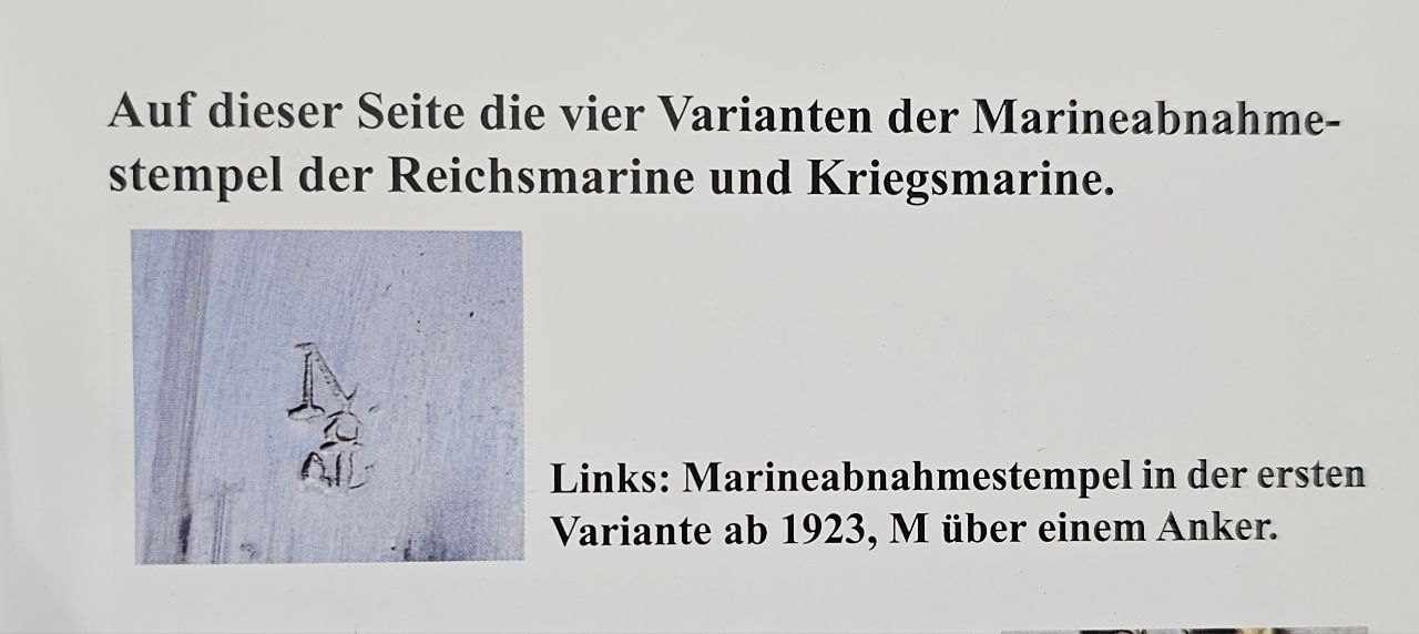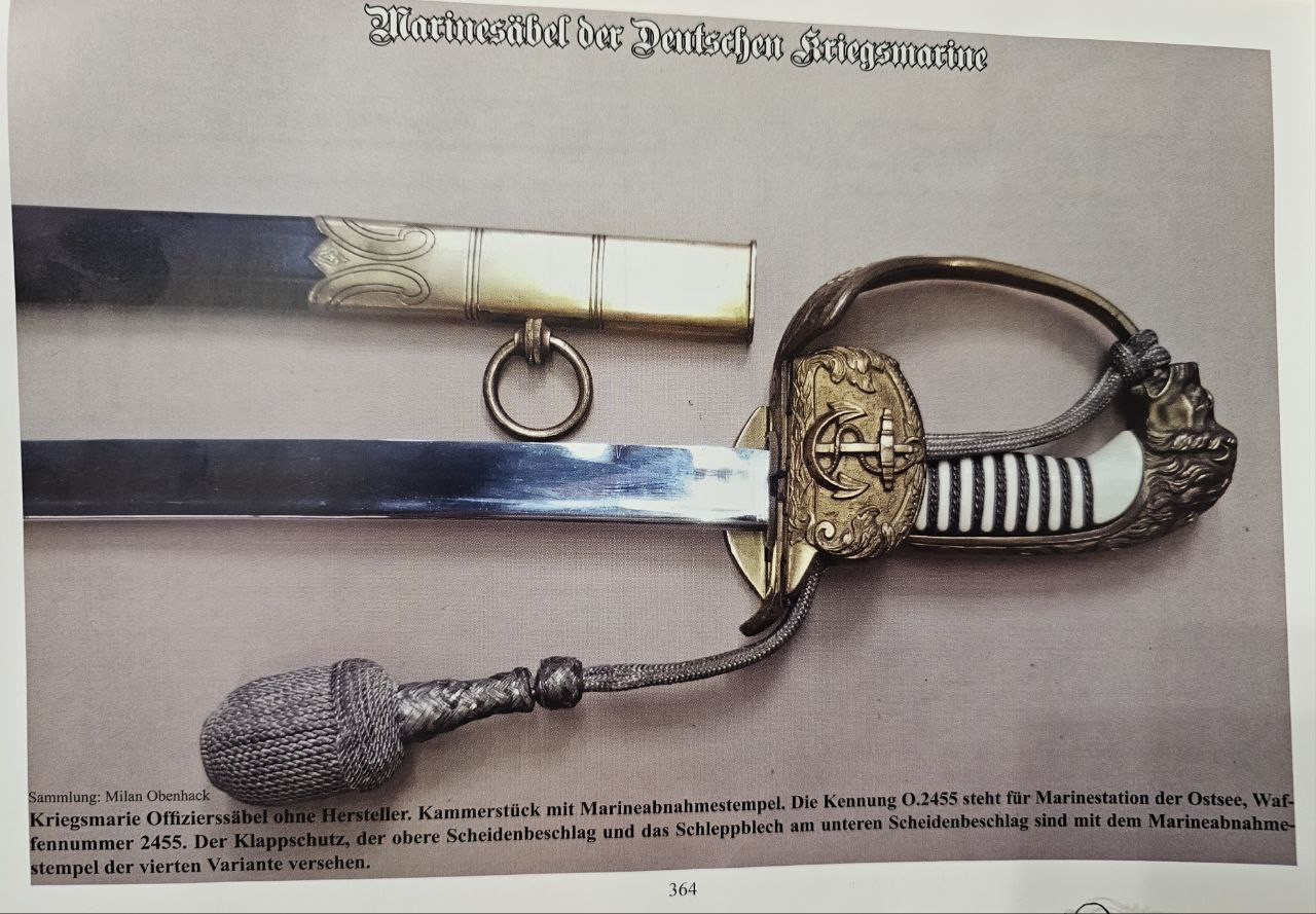 Судя по имеющимся клеймам, сабля является не частной покупкой, а официально выданным флотом служебным образцом, что подтверждается соответствующими служебными маркировками. Клеймо в виде буквы «M» над якорем представляет собой военно-морской приёмочный штамп первого образца. Маркировка «O.92» расшифровывается как «O» — Ostsee (Балтийское море), «92» — номер оружия.