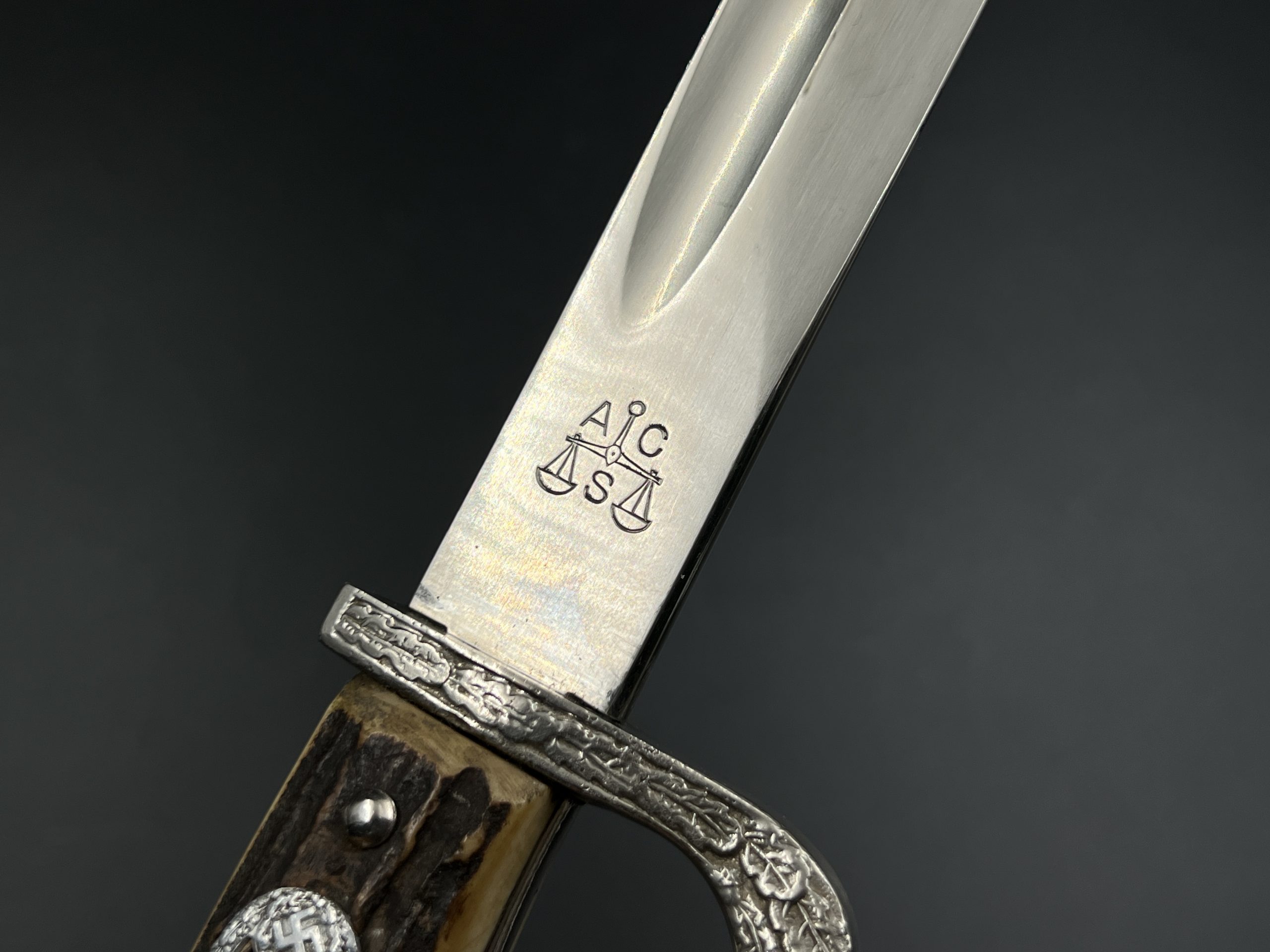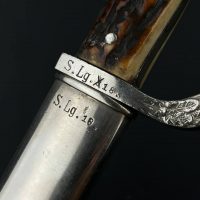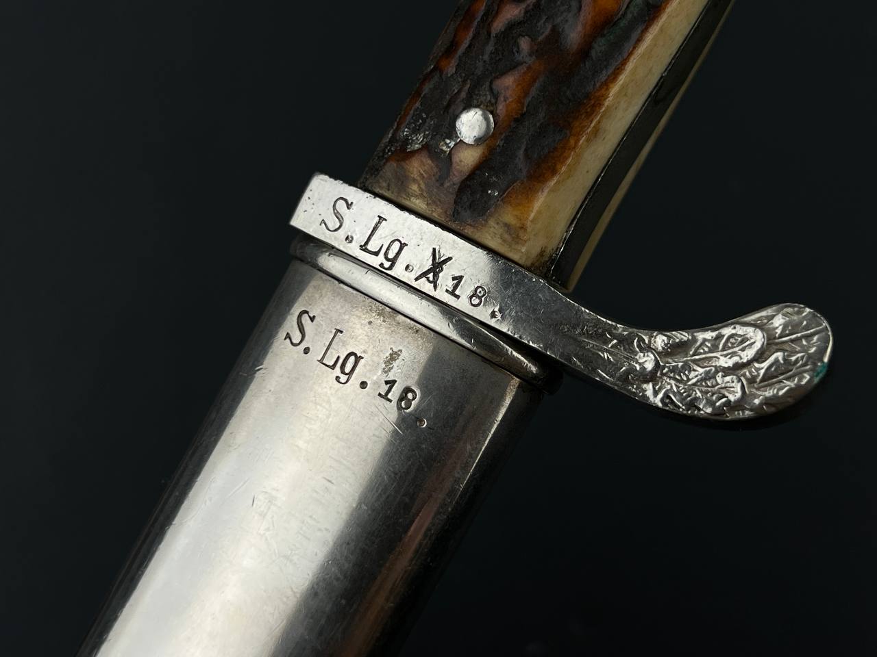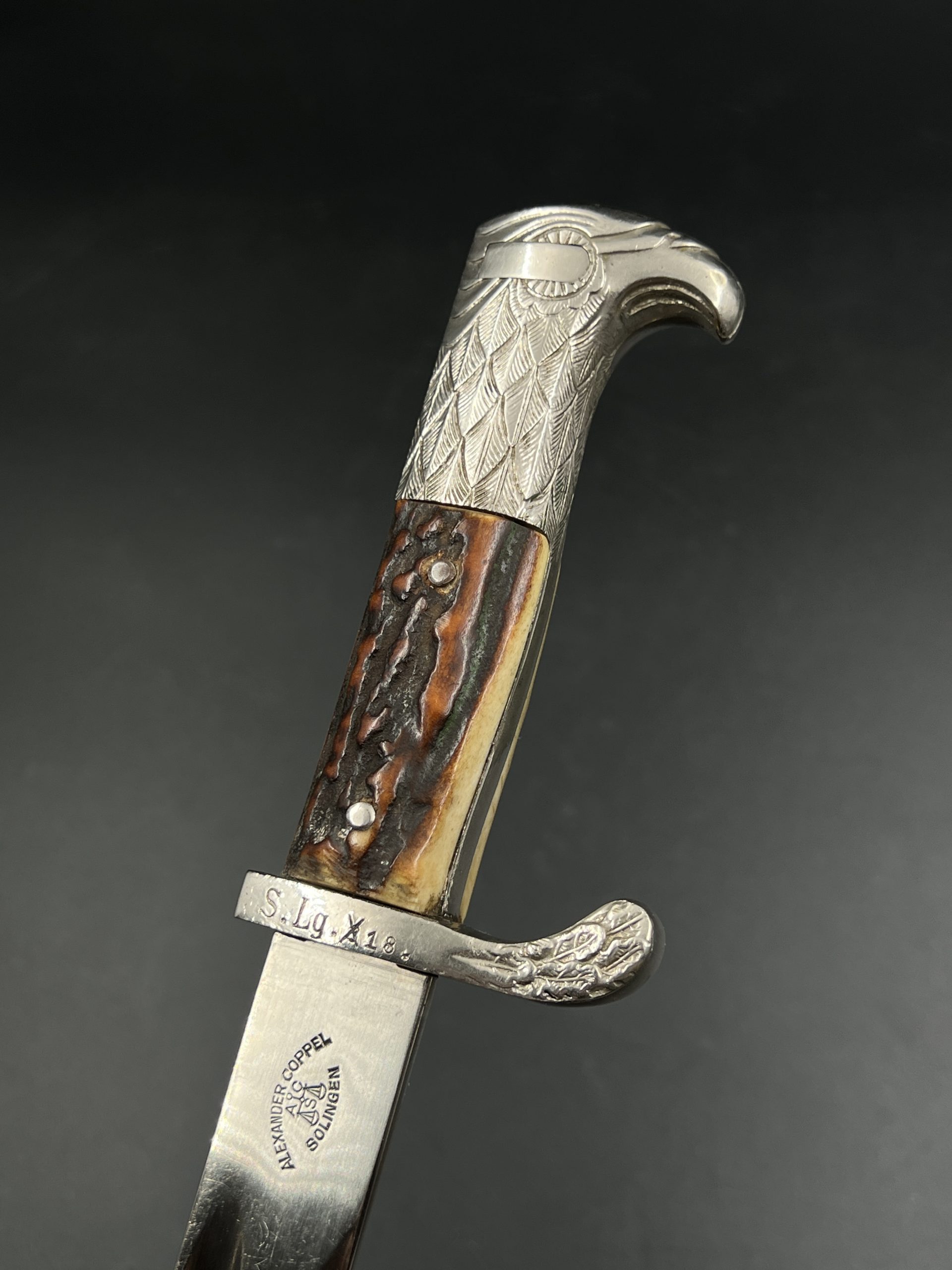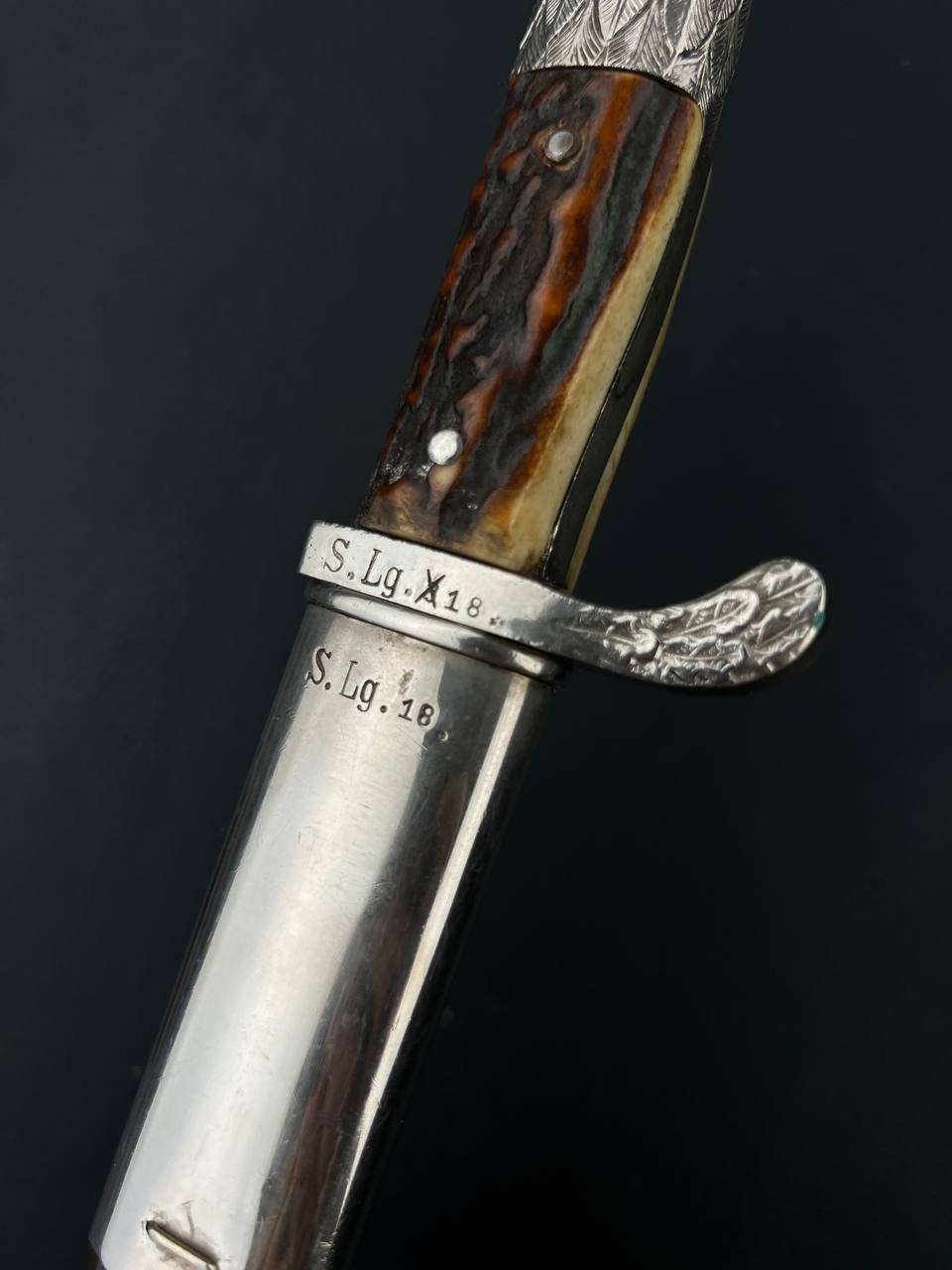 На крестовине и на ножнах с обратной стороны присутствует клеймо «S. Lg. 18.». Согласно таблице из книги Томаса М. Джонсона “Collecting the Edged Weapons of the Third Reich” (Коллекционирование холодного оружия Третьего рейха) в томе 4, страница 215-216, эту надпись можно расшифровать следующим образом: S –маркировка принадлежности к муниципальной полиции (Schutzpolizei), Lg – маркировка административного округа Lüneburg.