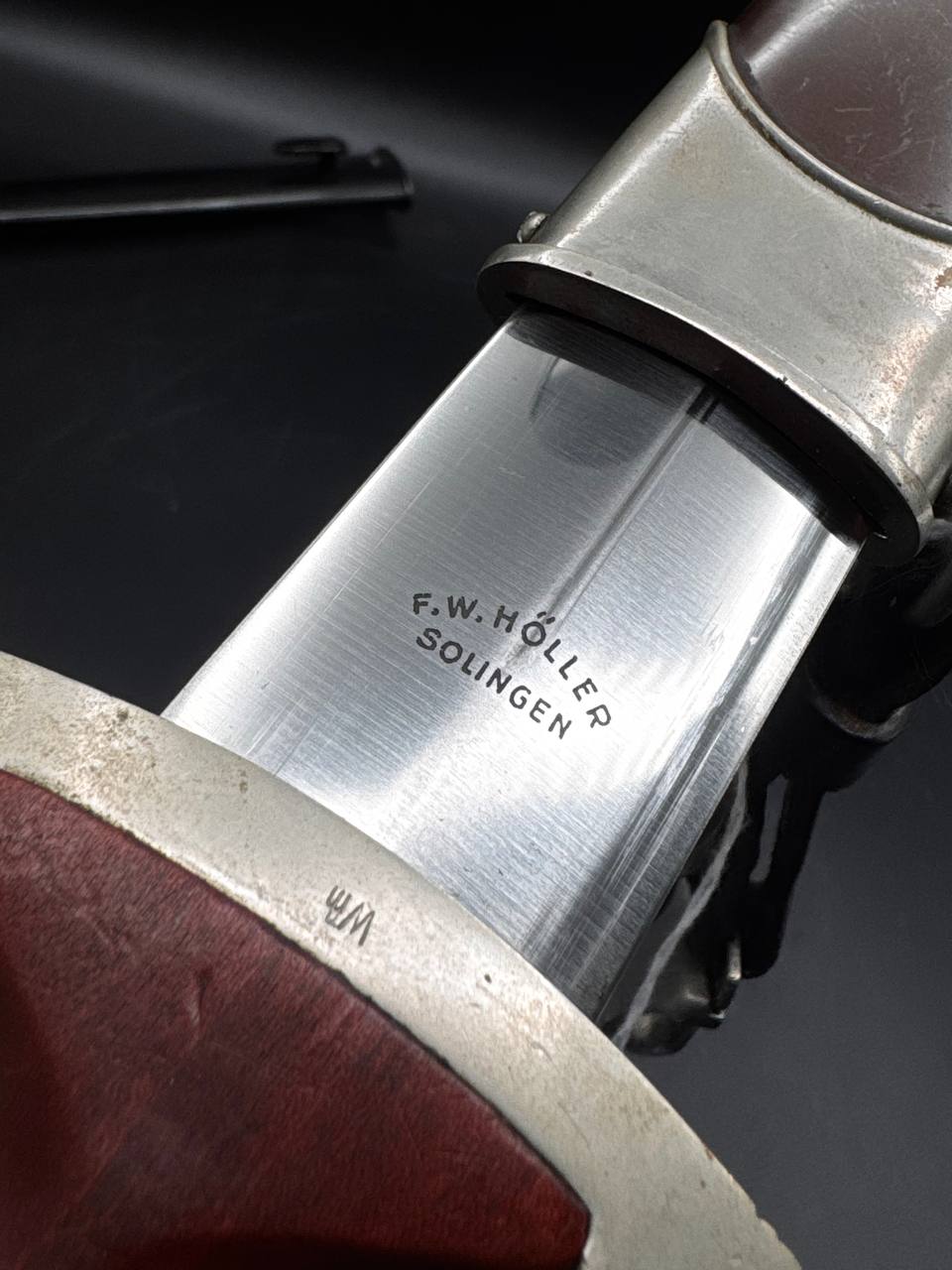F. W. Höller Waffenfabrik была основана в 1866 году и официально зарегистрирована в органах Золингена 5 июня 1883 года. С момента основания фирма специализировалась на производстве холодного оружия и столовых приборов. В течение конца XIX века и во время Первой мировой войны предприятие выпускало широкий спектр военных изделий, включая штыки, сабли и мечи. В 1905 году компания зарегистрировала свои известные товарные знаки: изображение термометра, а также фигуру человека, снимающего шляпу, с надписью «Hut ab!» («Снимаю шляпу!»). С 1914 по 1939 год управлением фирмы занимался Julius Küller. В период Третьего рейха Höller стал одним из крупнейших и наиболее массовых производителей холодного оружия в Золингене, специализируясь на широком ассортименте военной продукции. В 1935 году компания располагалась по адресу Sonnenstraße 8, Solingen, и в том же году получила лицензию RZM M7/33. Продукция активно рекламировалась в специализированных журналах и каталогах, где демонстрировался обширный ассортимент, включавший кинжалы НСДАП и Вермахта, мечи и штыки. Фирма также выпускала парадные штыки с высококачественными травлёными клинками. В 1941 году Höller отметил своё 75-летие, продвигая как флагманскую модель меч Höller Model 21. В июне 1941 года компании был присвоен буквенный код производителя штыков K98 — «fze». После окончания Второй мировой войны, под руководством владельца Herr Grah, фирма продолжала деятельность, производя столовые приборы, кухонные и профессиональные ножи, мечи и ножницы вплоть до 1970-х годов. Компания была официально ликвидирована в декабре 1974 года.