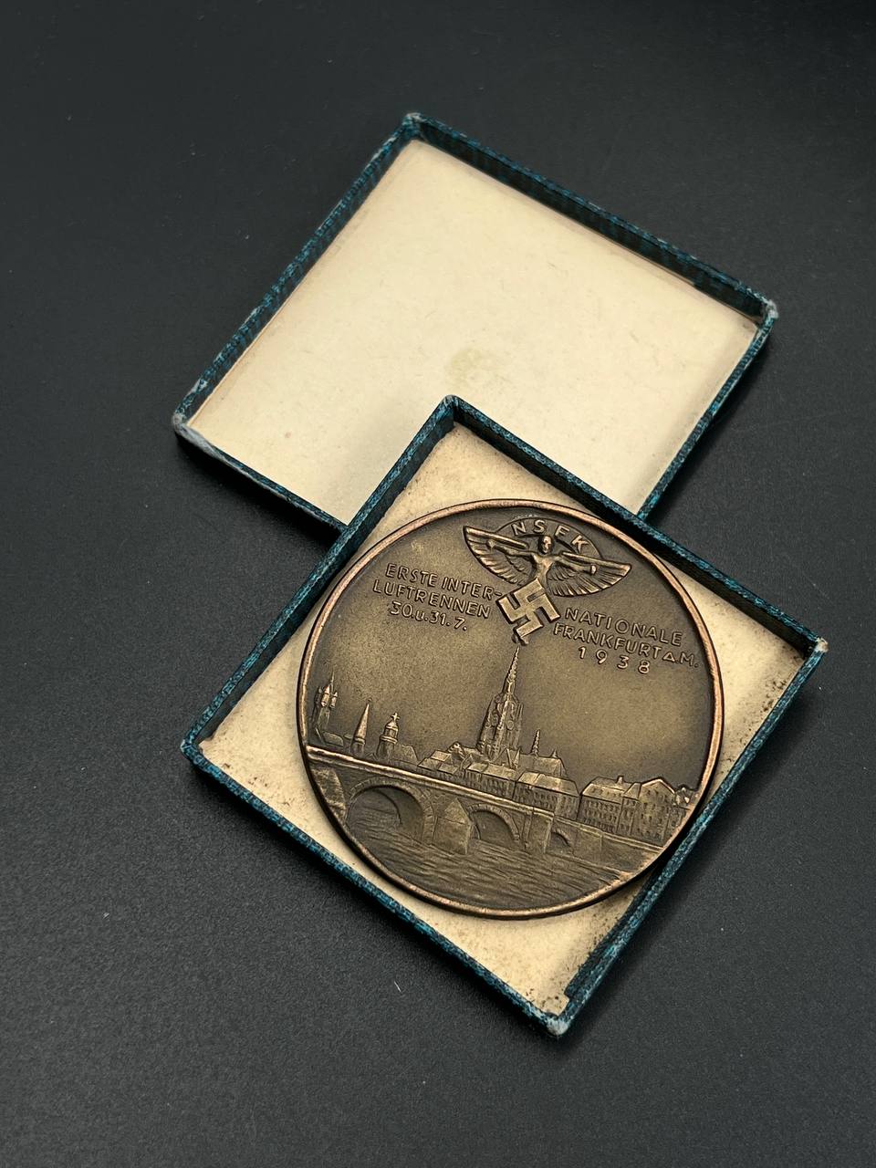 Эта памятная медаль была вручена участникам первых международных воздушных гонок, организованных Национал-социалистическим лётным корпусом (NSFK) во Франкфурте-на-Майне 30–31 июля 1938 года. NSFK был парамилитарной организацией, созданной в 1937 году для подготовки молодёжи к службе в Люфтваффе через обучение авиации и распространение нацистской идеологии.​
