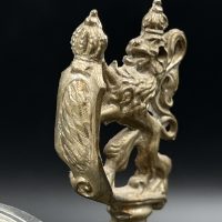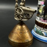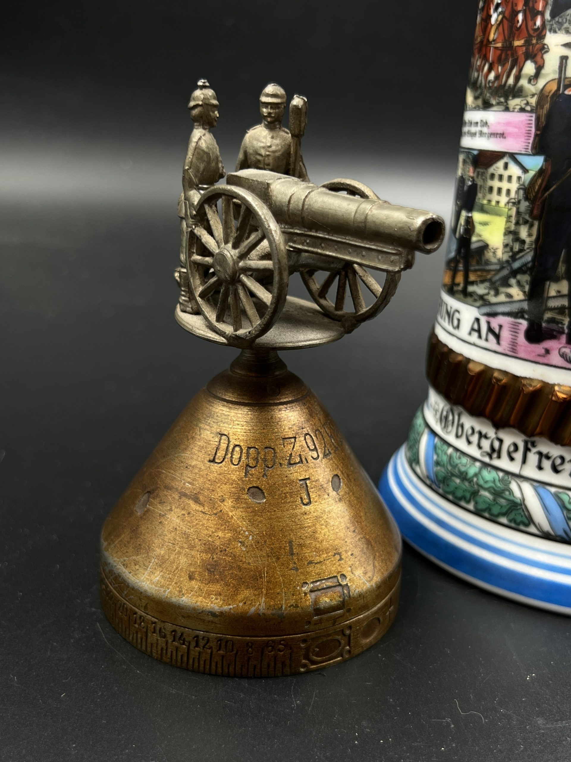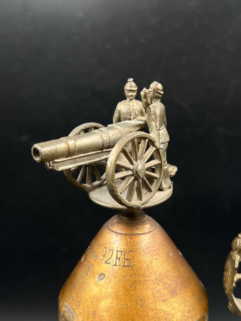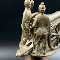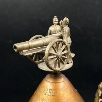 Крышка украшена рельефным орнаментом и навершием в виде артиллерийского орудия с фигурами солдат.