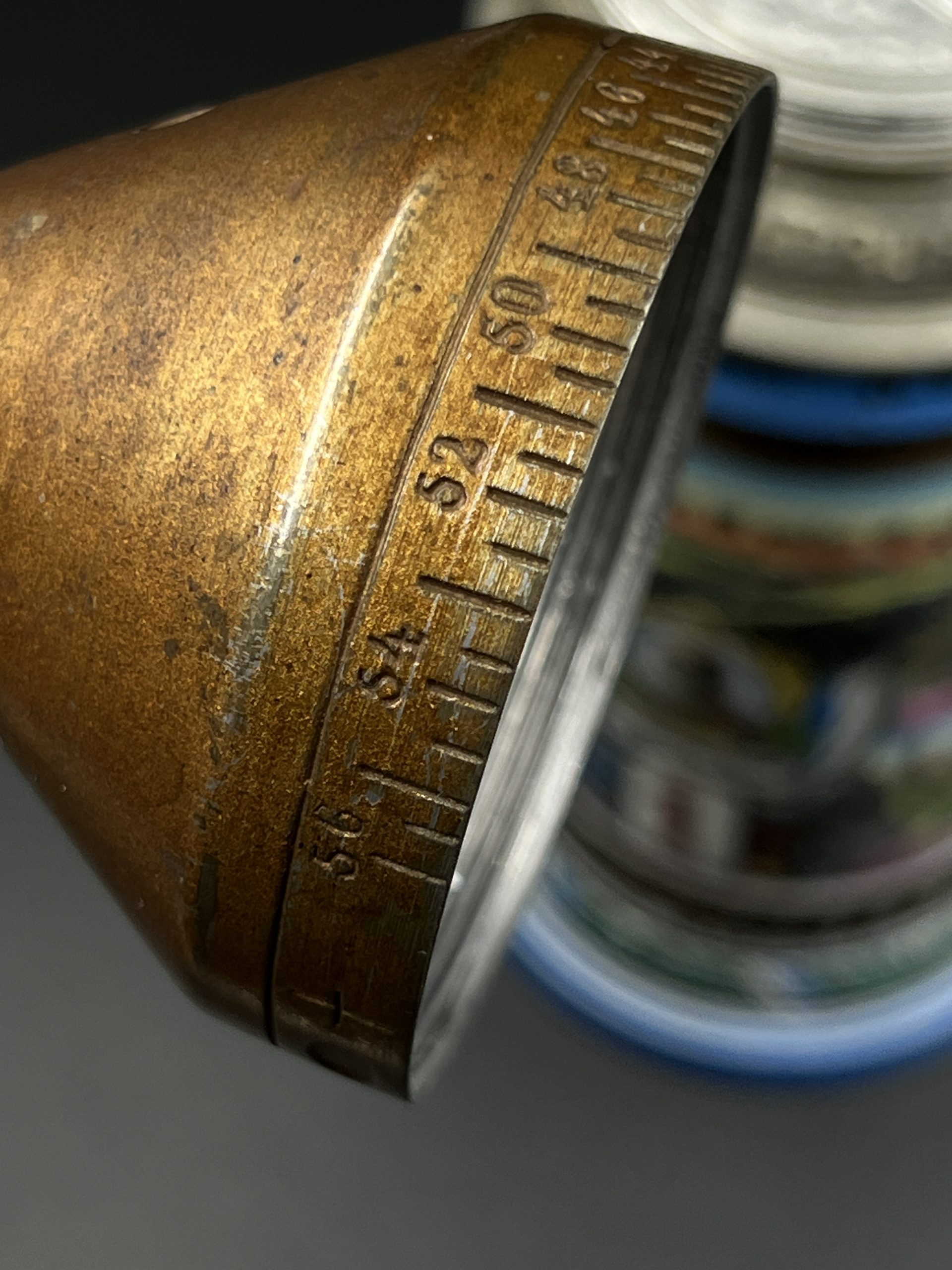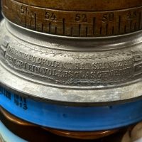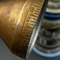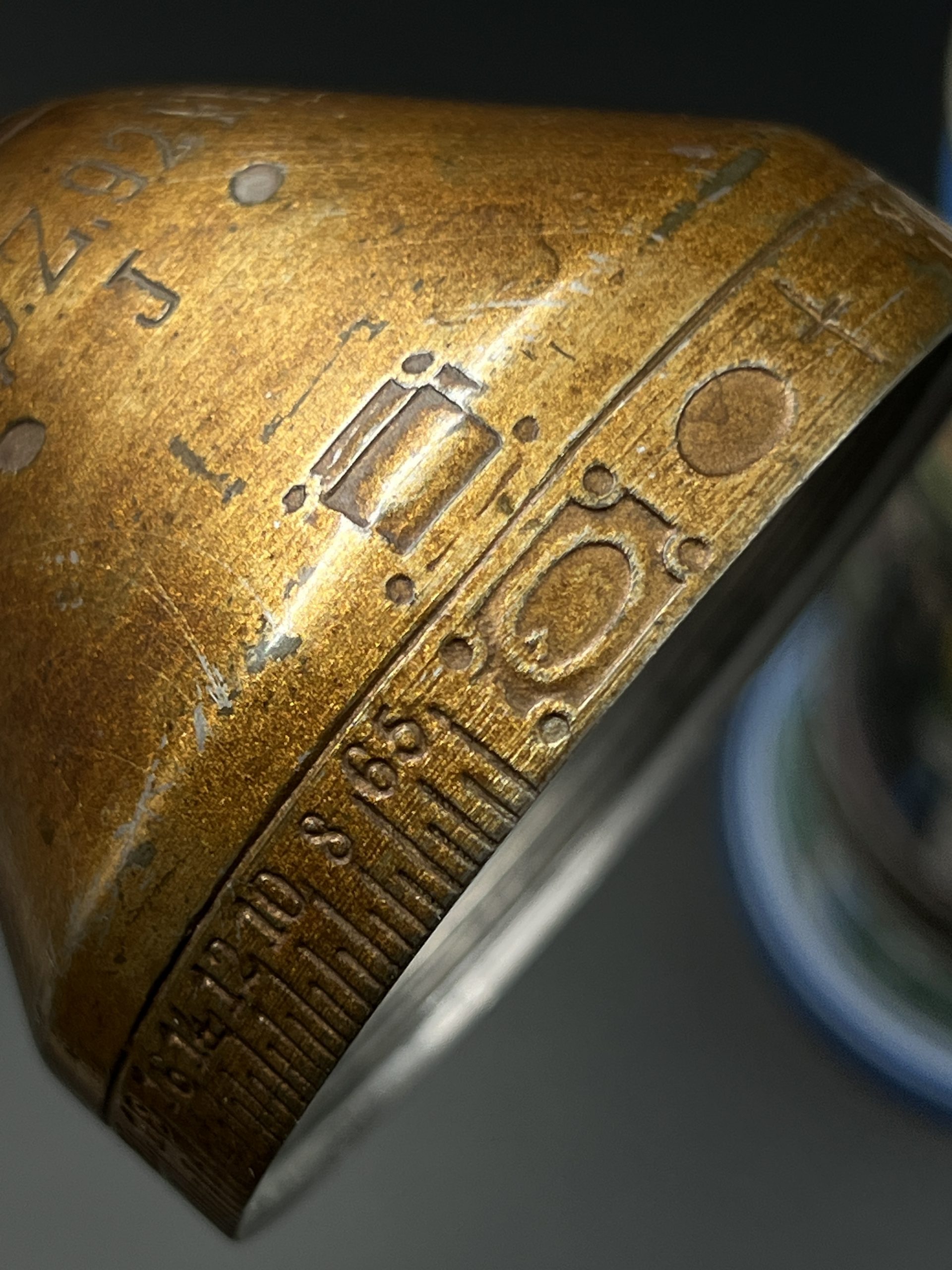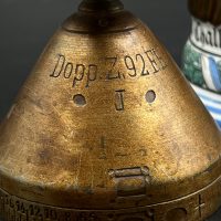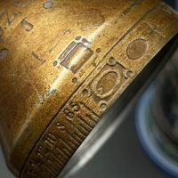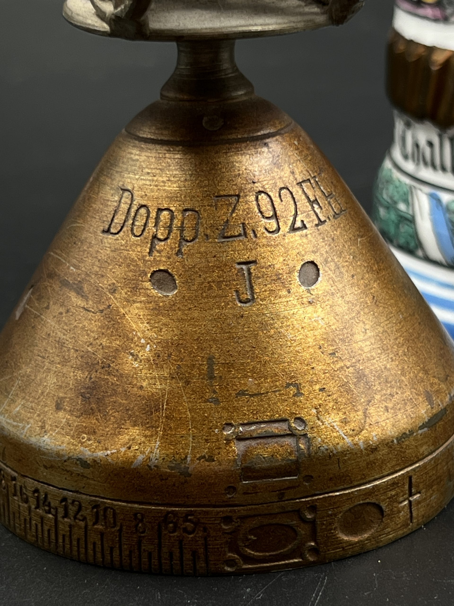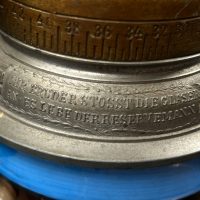 Особую ценность представляет металлическая крышка — она отвинчивается и выполнена в виде дистанционной трубки (артиллерийского взрывателя). По периметру нанесена характерная шкала с делениями и цифрами, имитирующая механизм установки времени подрыва снаряда. Данный элемент является редким и напрямую отражает принадлежность владельца к артиллерии.