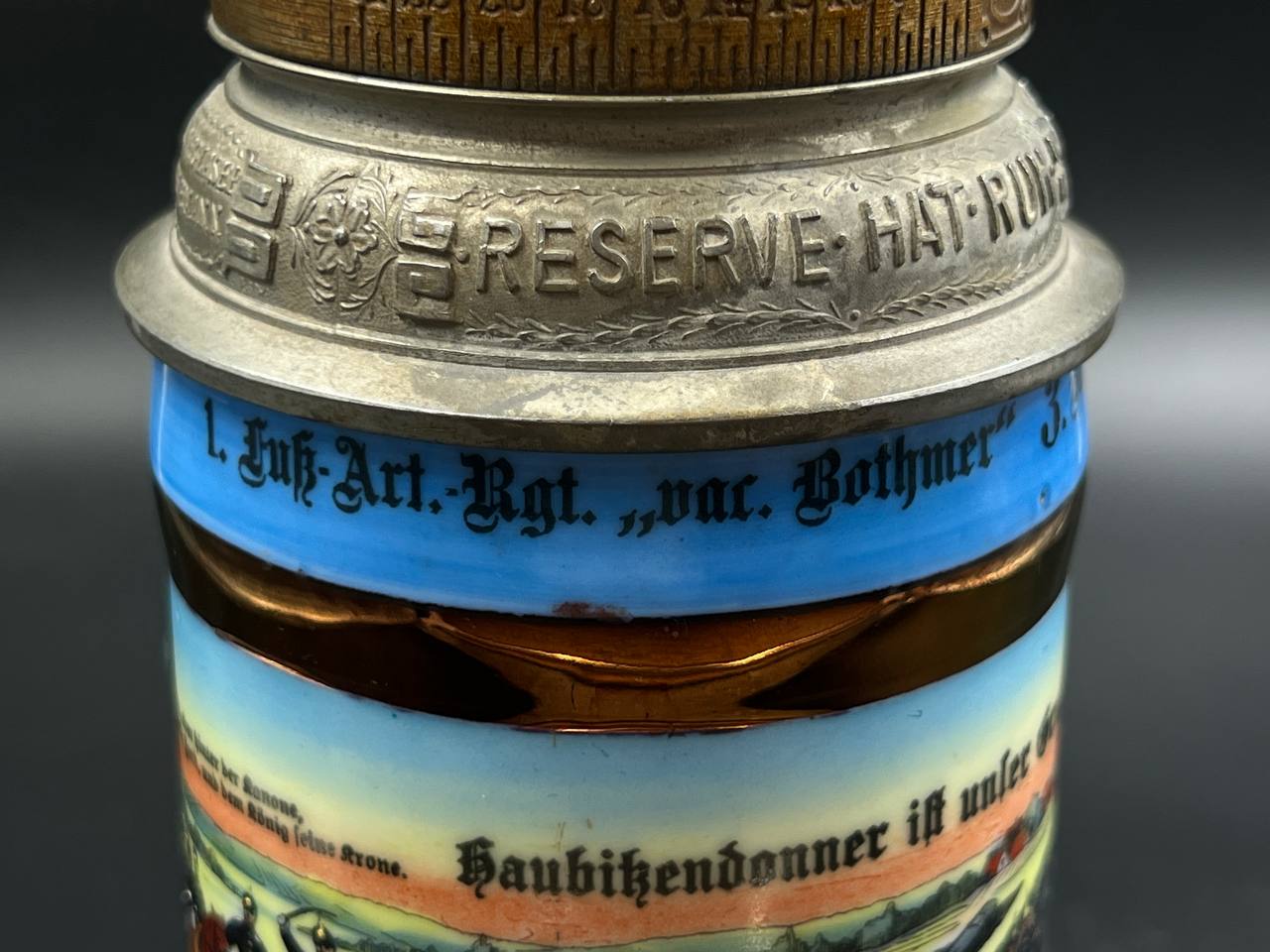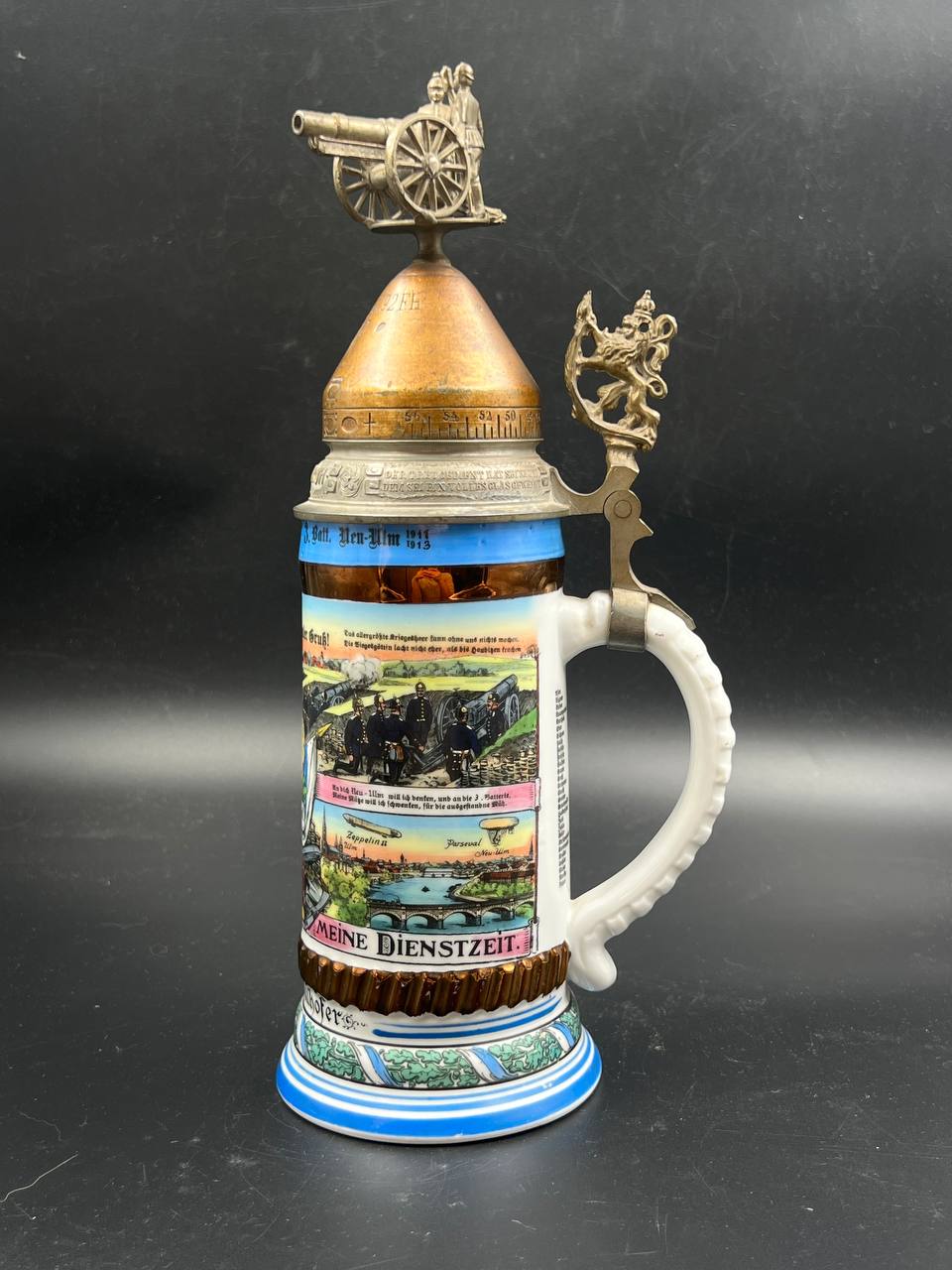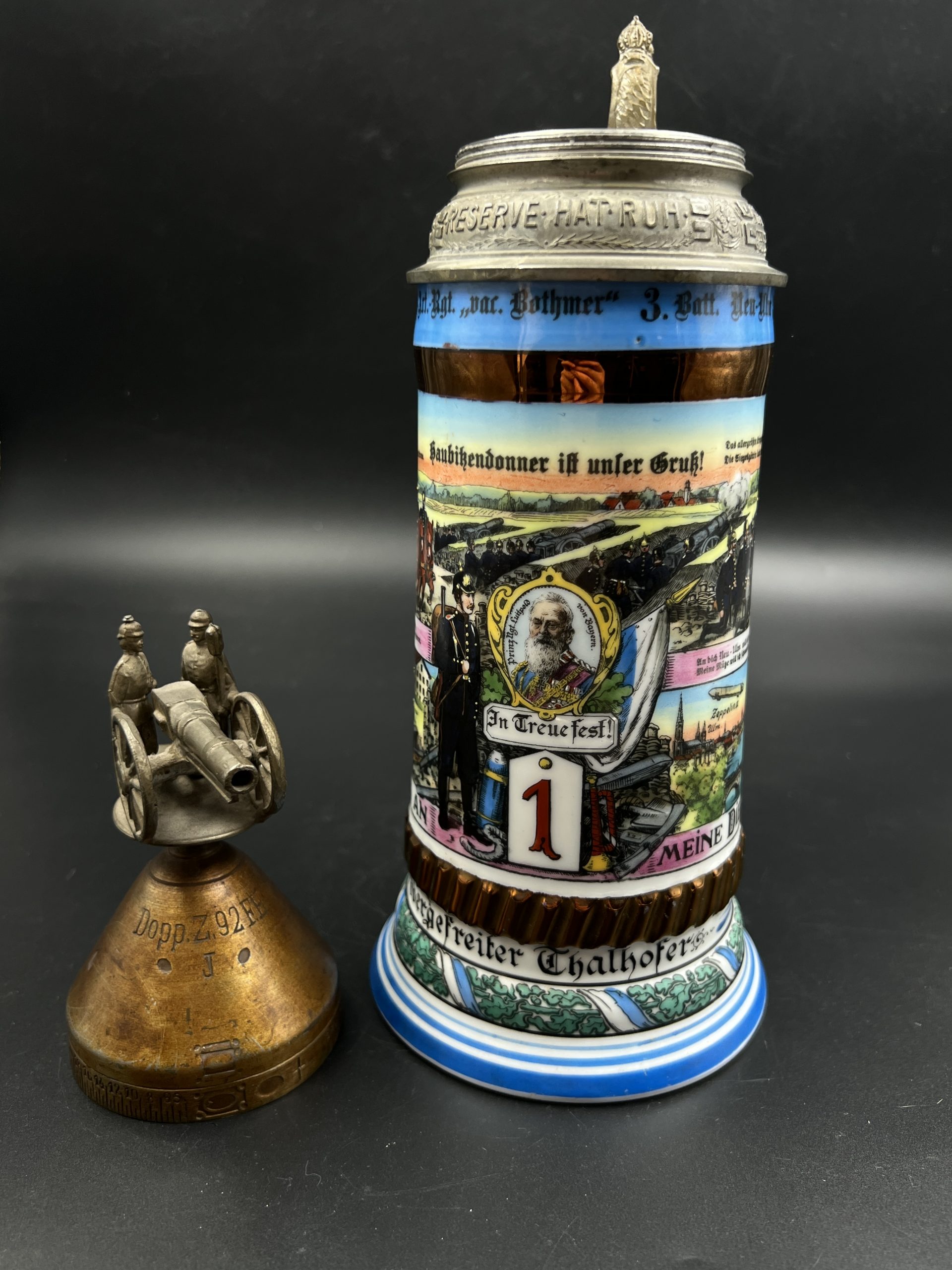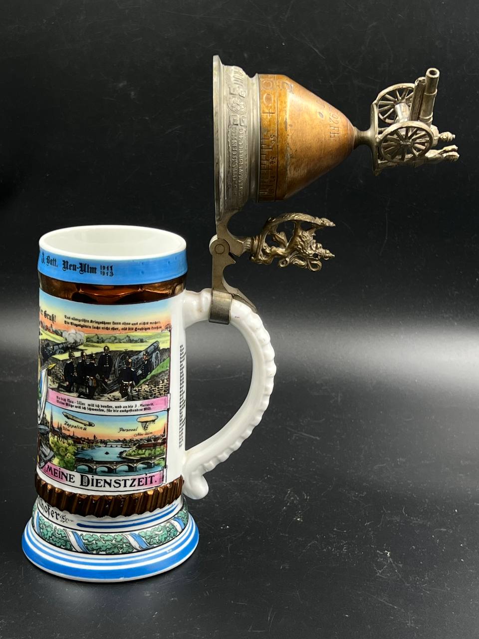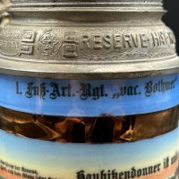 Немецкая резервистская пивная кружка с откручивающейся крышкой — 1-й пеший артиллерийский полк «фон Ботмер», 3-й батальон, Neu-Ulm (1911–1913).