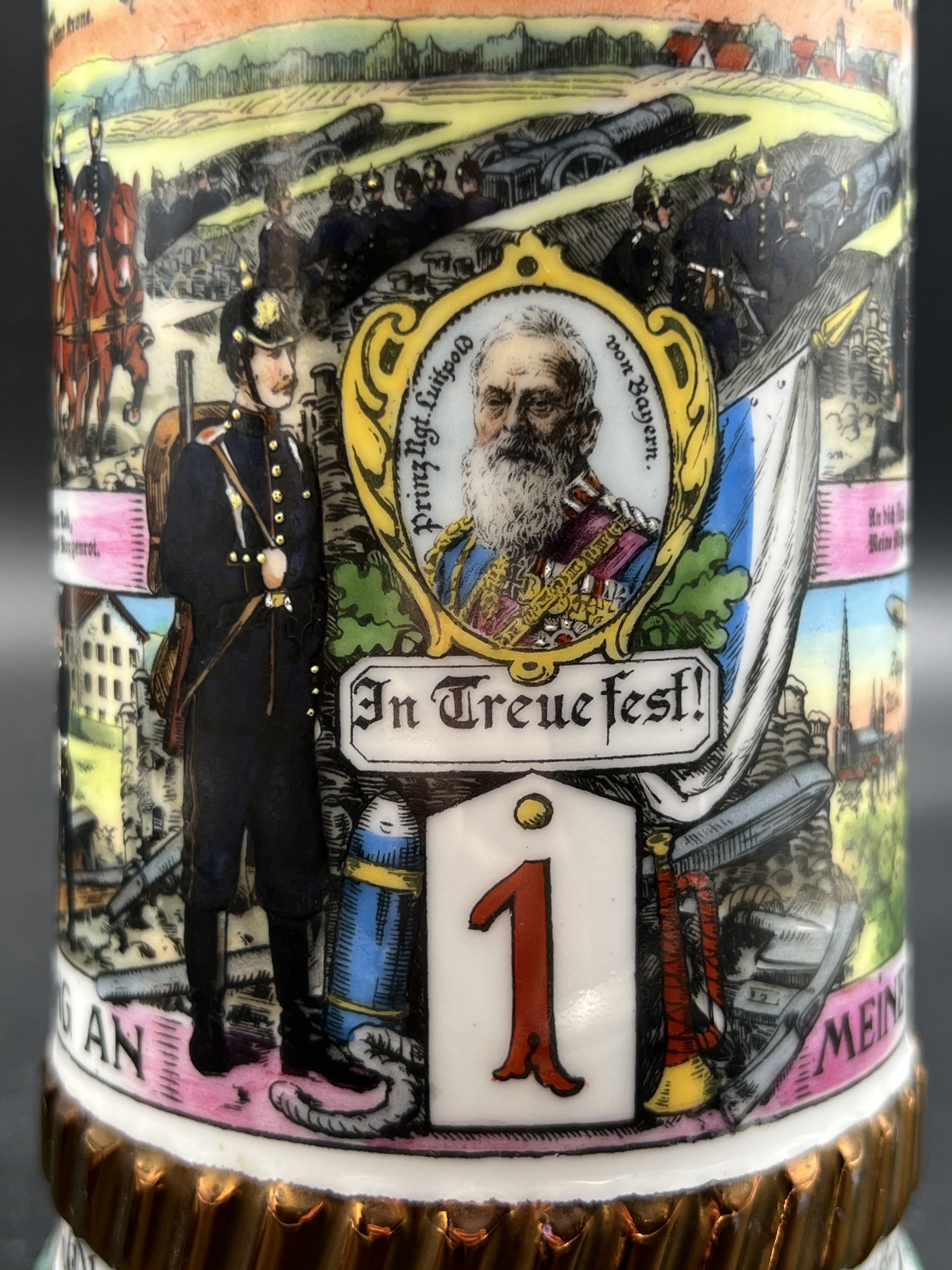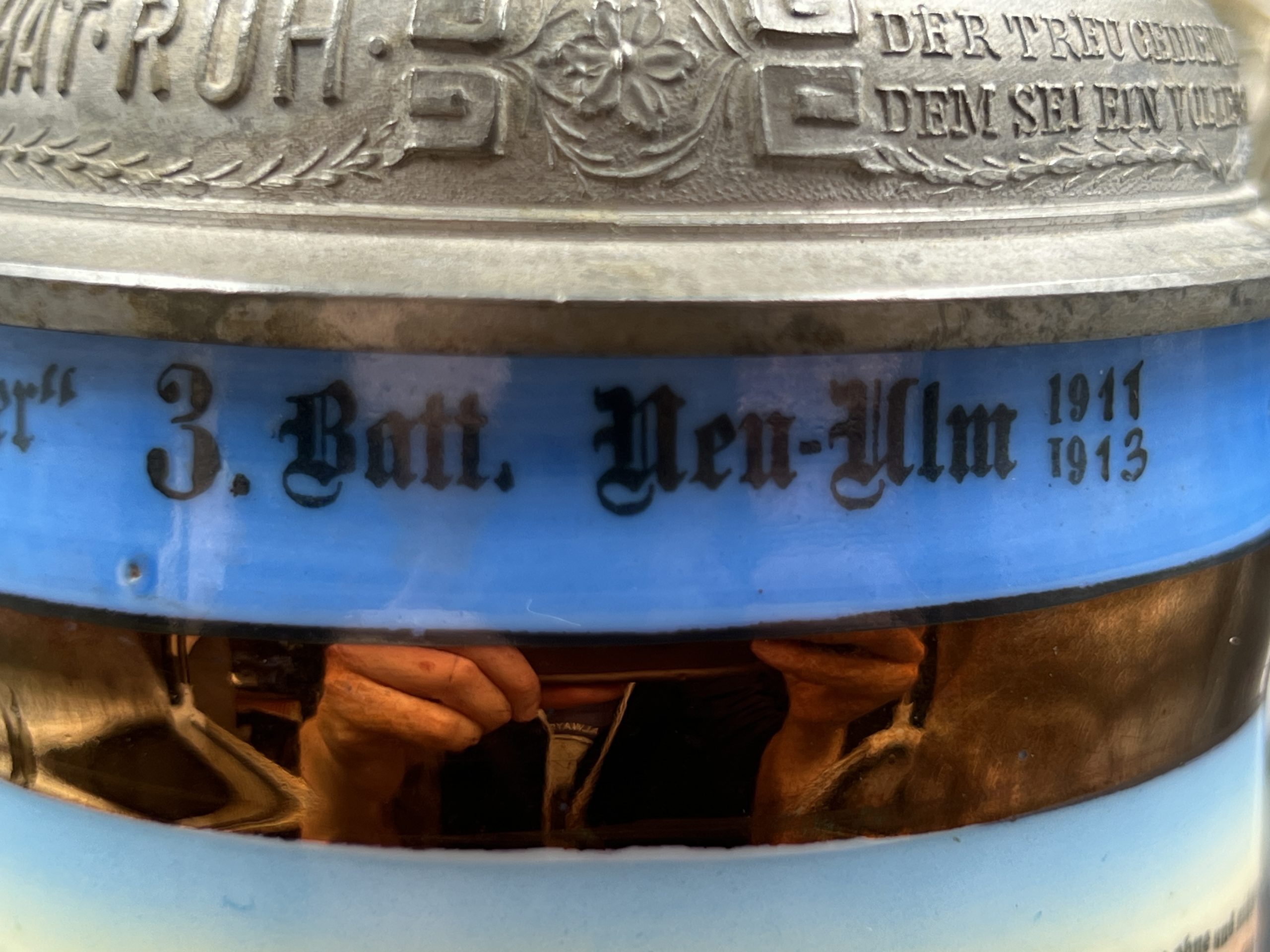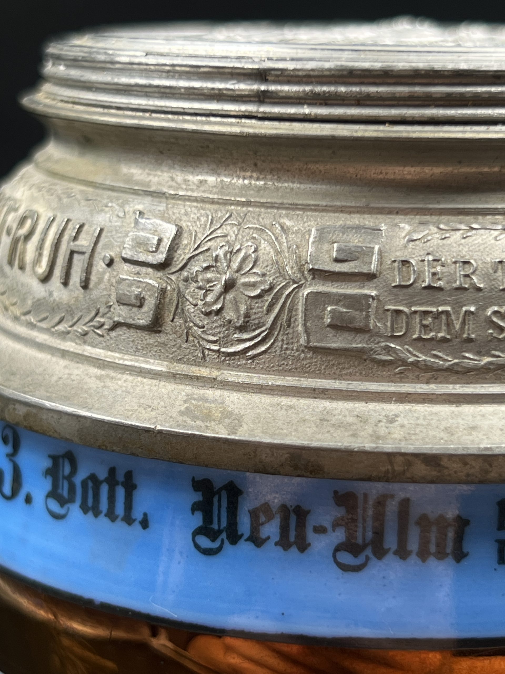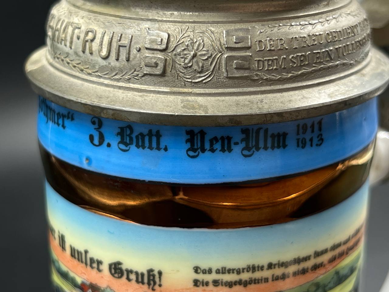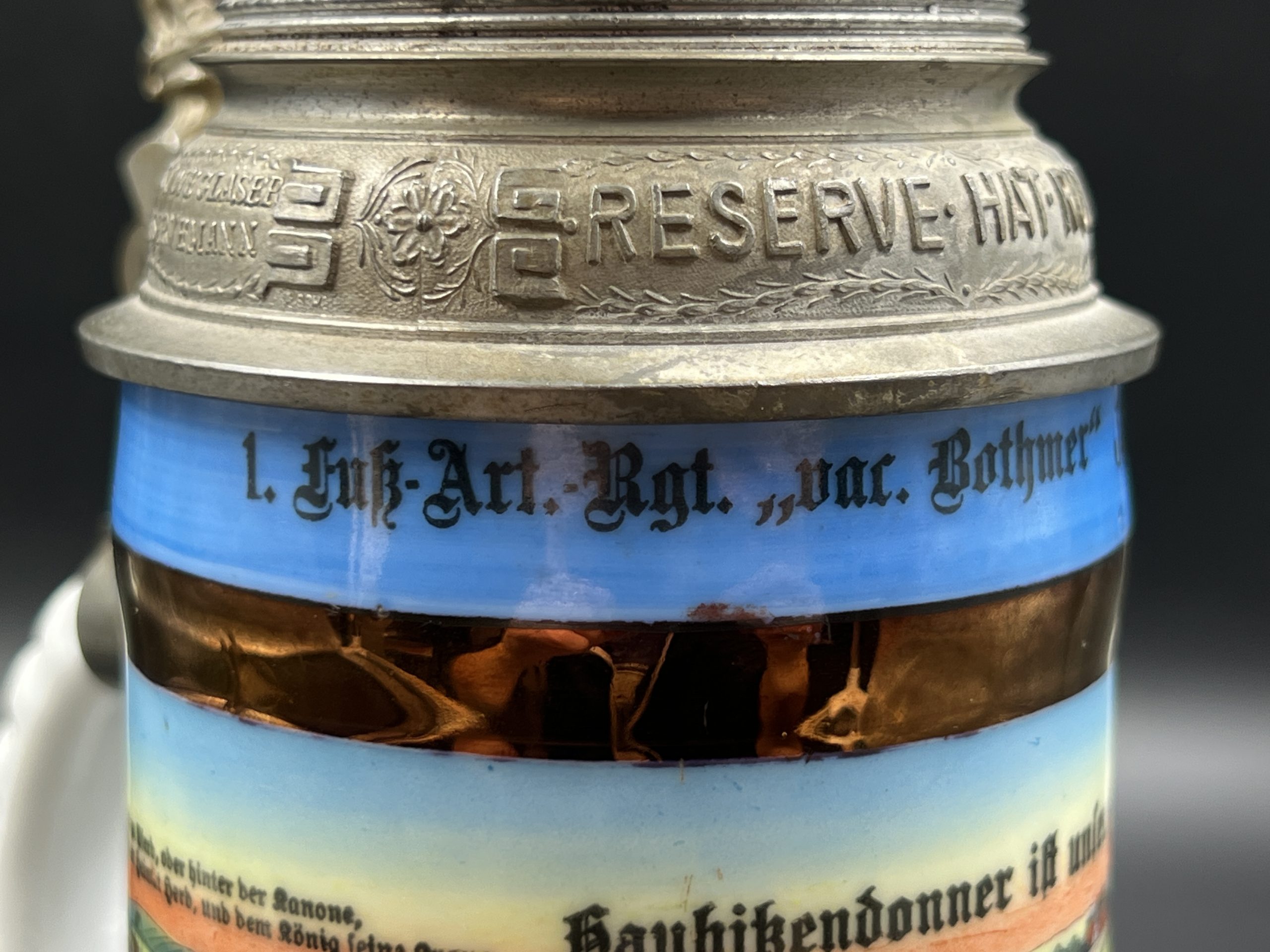 Немецкая резервистская пивная кружка с откручивающейся крышкой — 1-й пеший артиллерийский полк «фон Ботмер», 3-й батальон, Neu-Ulm (1911–1913).