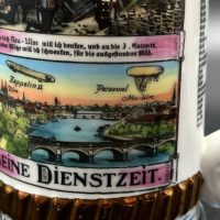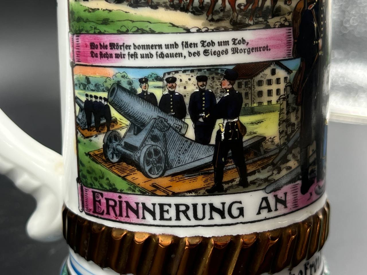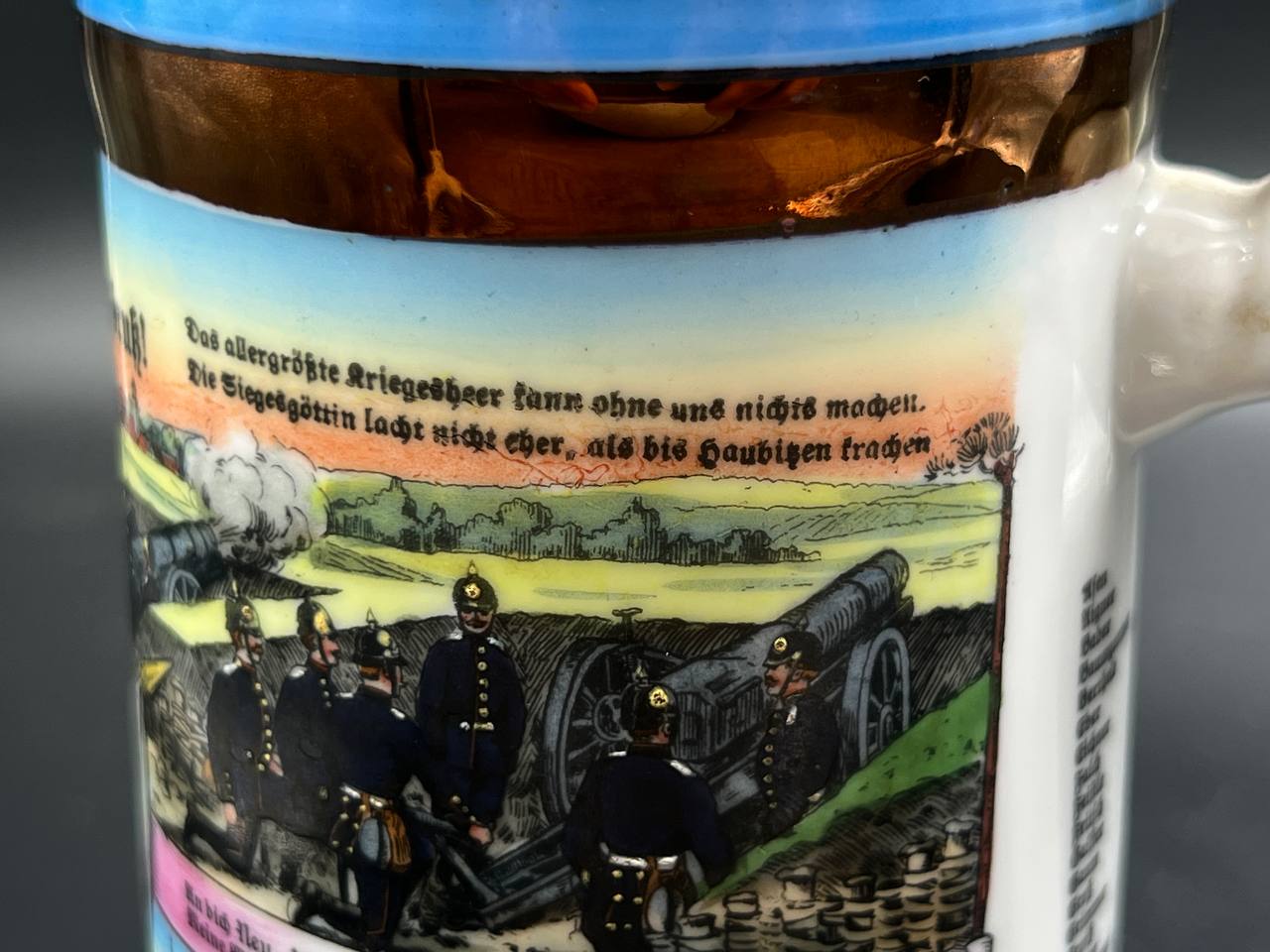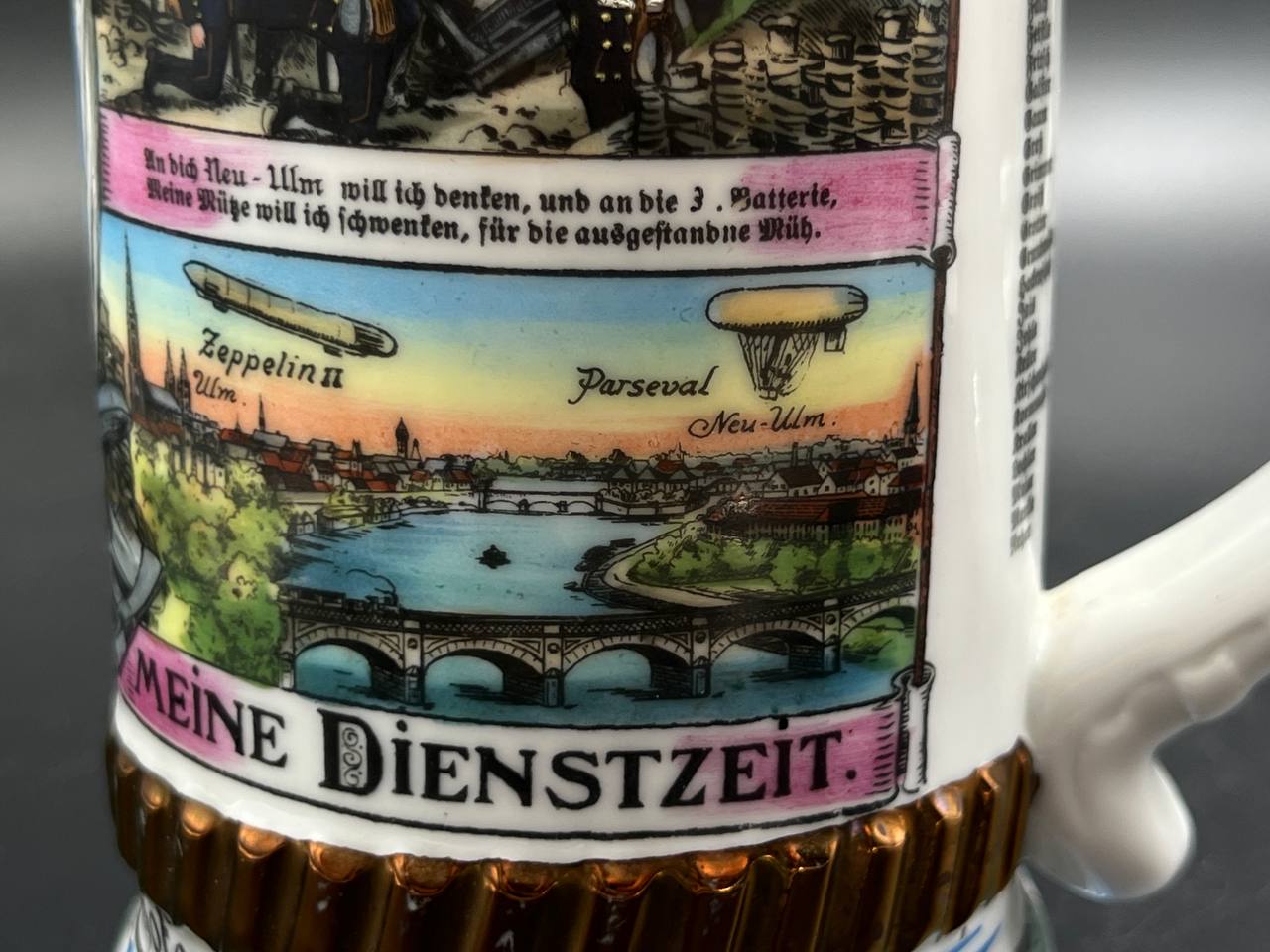Кружка выполнена из керамики с многоцветной деколью, изображающей сцены военной службы, артиллерию и солдат. Присутствуют надписи на немецком языке, включая “Meine Dienstzeit” («Моя служба»), а также указание подразделения: