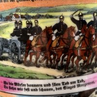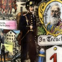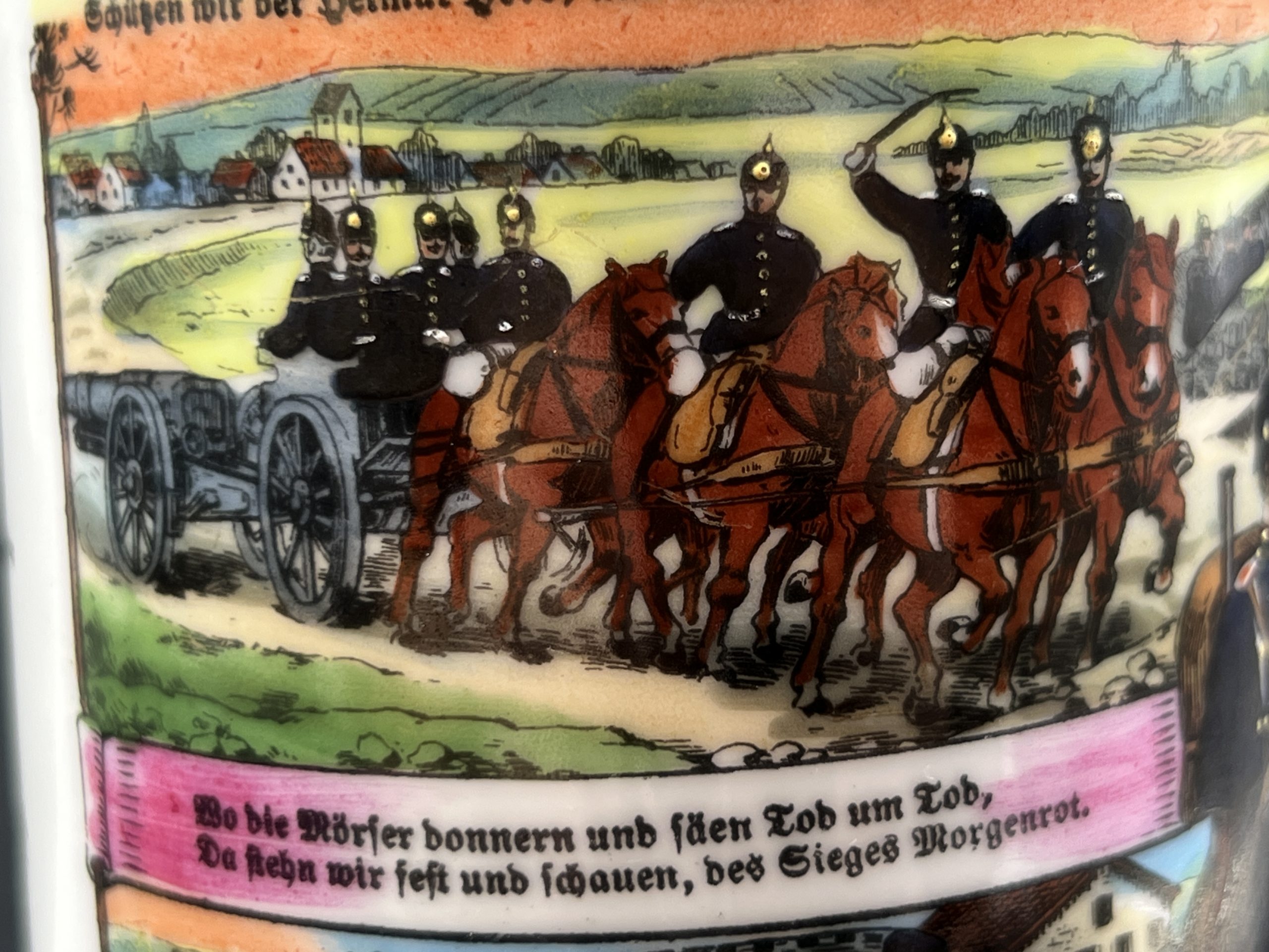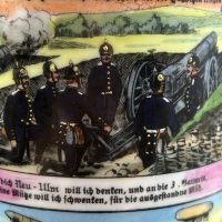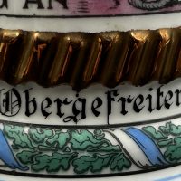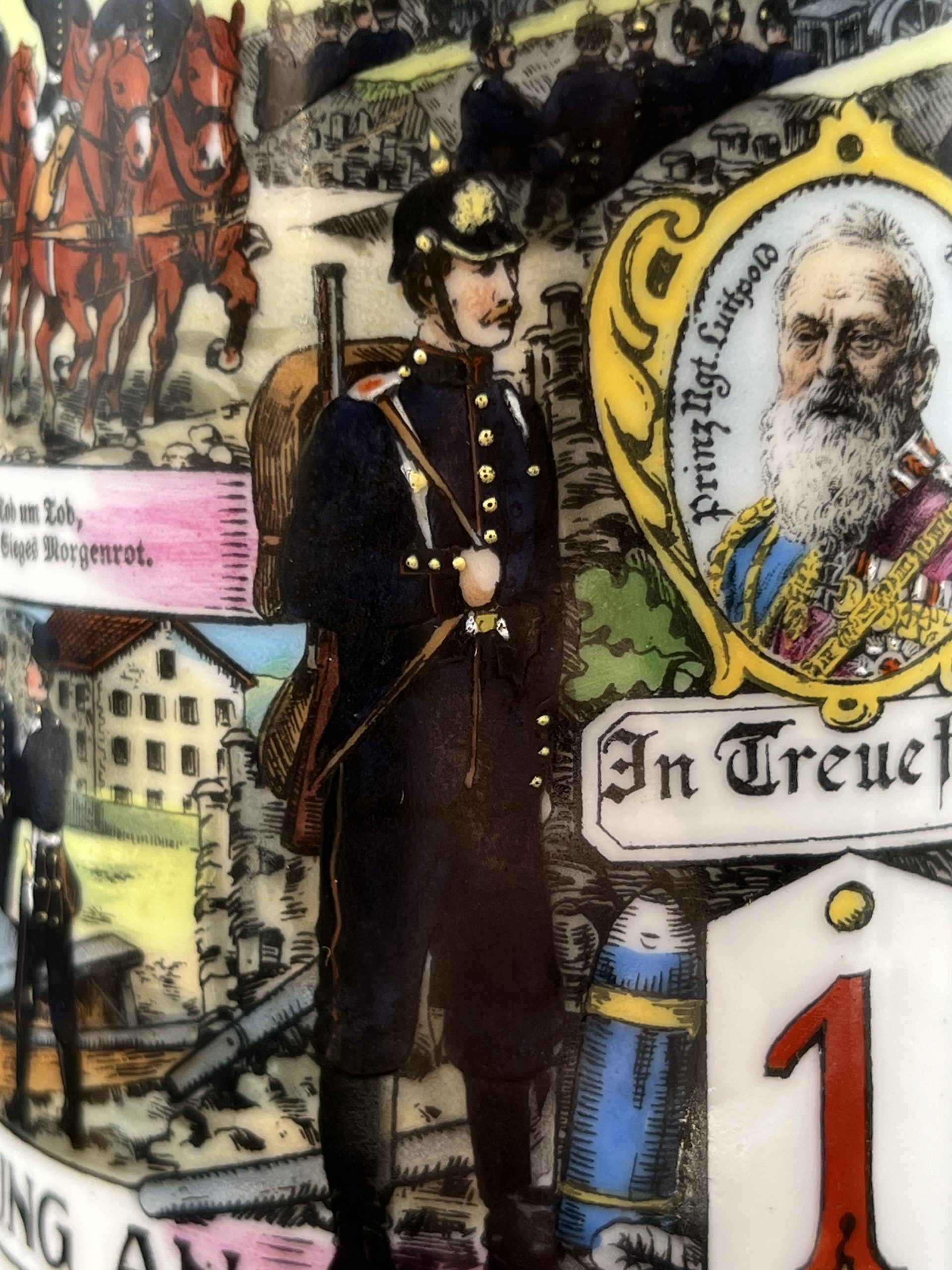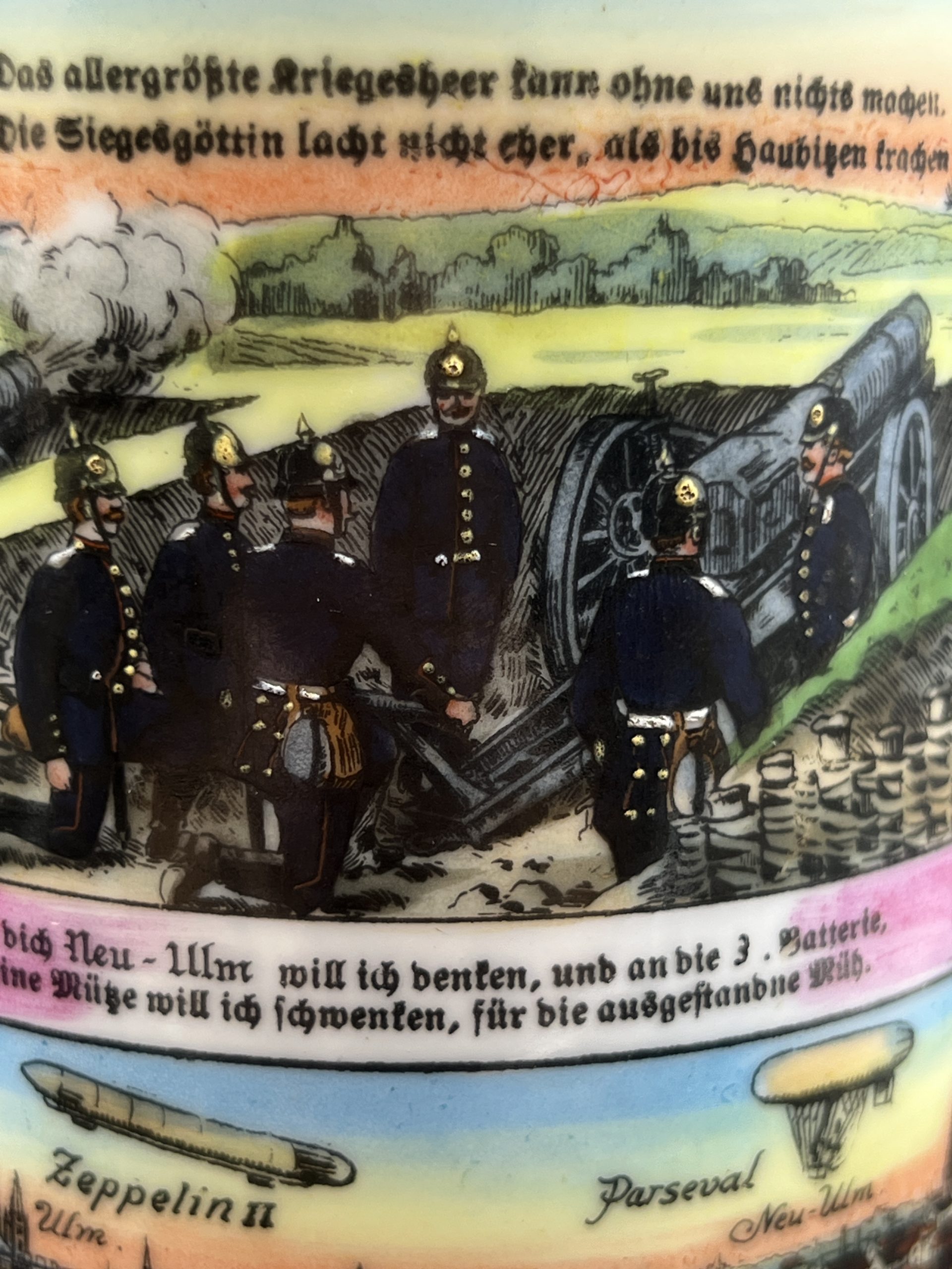 Кружка выполнена из керамики с многоцветной деколью, изображающей сцены военной службы, артиллерию и солдат. Присутствуют надписи на немецком языке, включая “Meine Dienstzeit” («Моя служба»), а также указание подразделения: